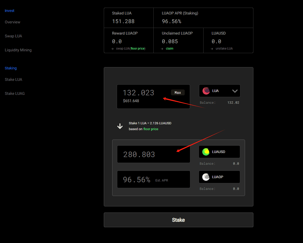 - 质押LUA将按照LUA底价获取相应数量的LUAUSD,并获得LUAOP奖励