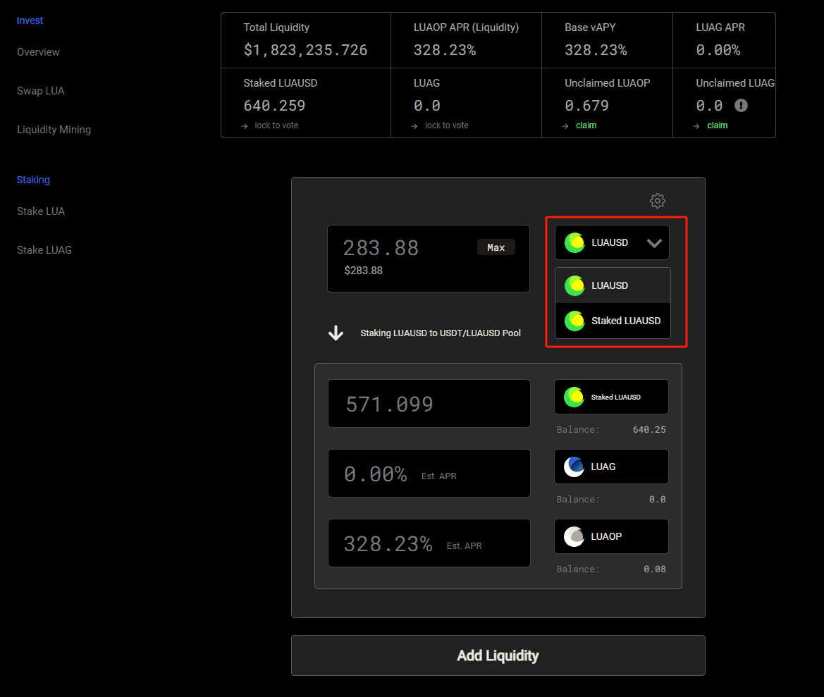 - 点击左侧 Liquidity Mining,自行选择质押数量后确定,质押后将获得LUAOP奖励,并有治理币LUAG的空投机会