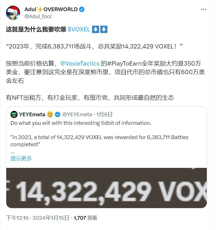 社区朋友整理的数据显示,2023年VOXEL游戏玩家共完成了638万场对战,其中有14,322,429枚VOXEL代币被奖励给游戏玩家,按照当前VOXEL(0.2)的价格估算,全年PlayToEarn的奖励大约是280万美金。