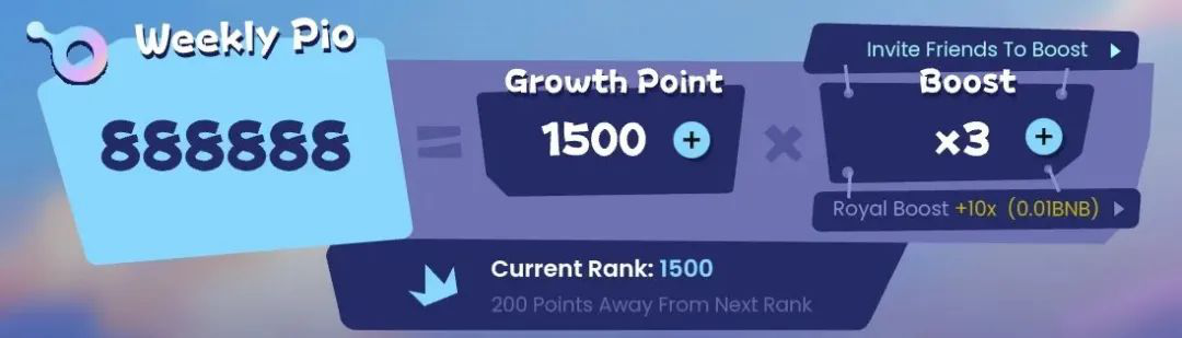 本次活动中获得的所有积分都将转入实际的游戏实用程序中。在此活动期间获得的资产,即 Palio NFT 及其相关特征,在Xterio生态系统中完全可互操作。所有积分和投票将按预定比例兑换Xterio生态系统空投。时间:4月第一周开始玩家通过日常的各种链上活动来积累Pio积分。Pio积分越多,将收到的Xterio 生态系统空投就越多;之后还能将Pio积分转入游戏中,获得实际的游戏功能。Pio积分由一个成长点数加上加权系数得出。活动每周一个主题,每周结束时结算积分,持续四周;每周的主题活动分3个单元。每周活动的3个单元, 第0单元:领取你的Palio蛋第1单元:培育你的Palio,获得成长点和加成系数【成长点获得】- 和你的Palio互动,通过喂食、玩耍、清洁、唱歌等活动;