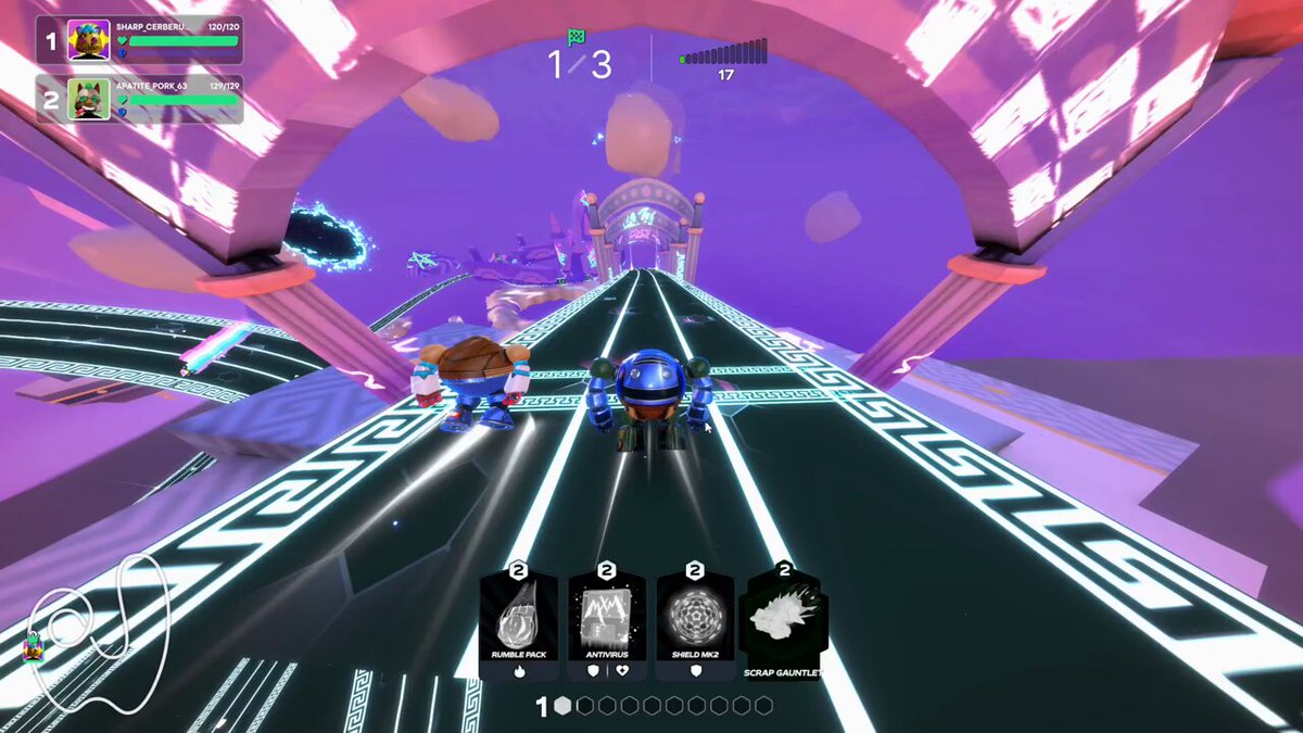 游戏玩法比较简单,可以理解为一种相对简化版的道具赛赛车游戏,比赛时角色会自动前进,玩家仅需通过点击屏幕左侧或者右侧来控制方向,以此吃道具、躲避障碍以及进入加速赛道。 另一方面你也要找准合适的时机来释放道具,从而加速、保护自身或者干扰对手。