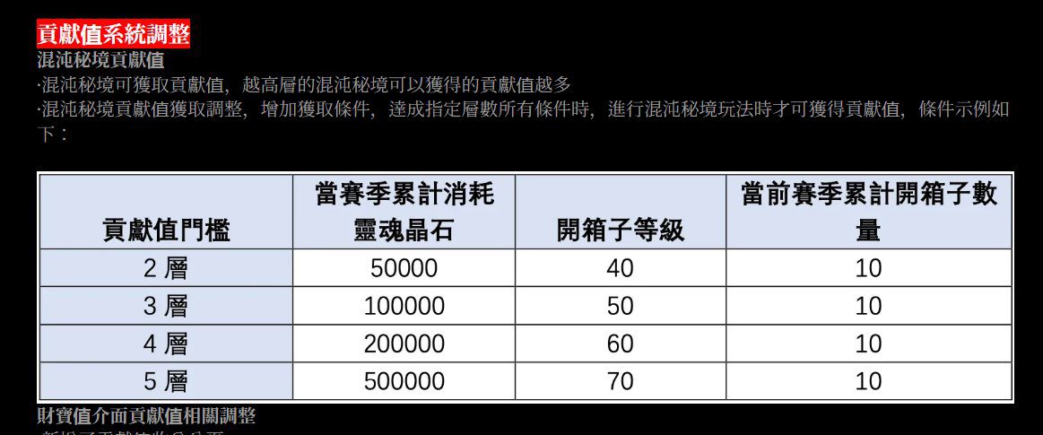 2.贡献值系统,针对的上述的装备财富值120以上可以打二层及以上秘境的朋友,通过打秘境、开箱子等相关行为,可以获取贡献值,然后按贡献值分享代币,官方说明中会有最多150万代币在这投放,考虑符合条件的只有少量的头部玩家,所以符合条件的建议必做,注意行为需要满足最低门槛值,最低要求包括秘境2层、消耗晶石5万、开40及箱子10个