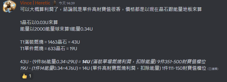 2.珍宝NFT持有者-建议玩。珍宝/装备NFT持有者本次主要有两个打金渠道,一是打晶石,尤其如果你有多件NFT的情况下,可以前面先穿一件冲能开门;狂暴的时候穿满,实现收益最大化,这里贴个课代表 @vince_BDB 做的初步测算 。据说最合适的方式是单件高财富值的,收益率最高。从DC里面一些会玩的人反馈来看,扣除掉充能费用(这版本箱子不出充能石了,只能从分解NFT获得,相当于充能成本增加了),整体能赚的,但是不多,只是肯定比零撸玩家好很多。