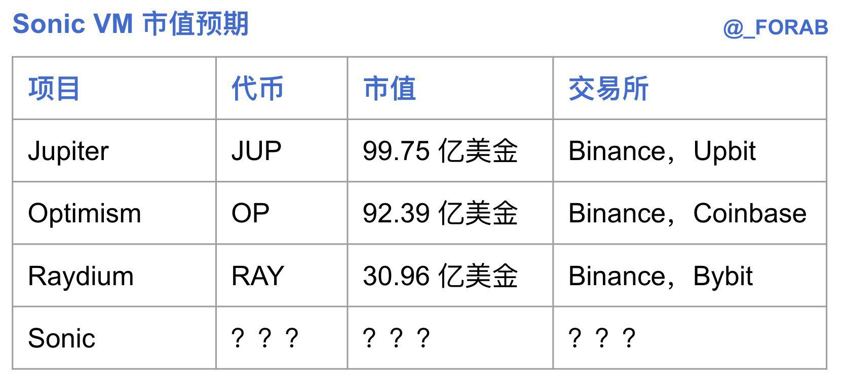 在市值预估方面,目前 Solana 的市值是 1200 亿,Jupiter 的市值是 110 亿,如果最终 Sonic 成为了基于 Solana 上数据最好的公链,以及承担了类似 OP Stack 一键发链的角色,预计市值在 30-50 亿左右。