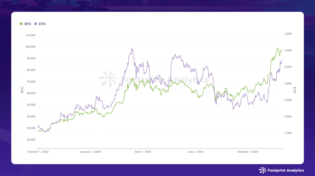 11 月加密货币市场创造历史,比特币涨幅惊人,从 69,386 美元飙升至 96,427 美元,涨幅达 39.0%。以太坊紧随其后,上涨 47.8%,从 2,511 美元攀升至 3,711 美元。比特币的卓越表现使其市值超越白银和沙特阿美,在 11 月 23 日接近 10 万美元关口后,稳居全球资产第七位。