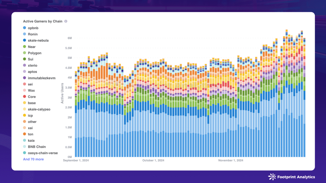 Ronin 展现出显著复苏,11 月 DAU 从 60 万翻倍至 120 万,这得益于新的合作伙伴关系,引入了多个游戏工作室,新游戏 Fableborne 的上线,以及现有游戏 Lumiterra 玩家数量重新增长。