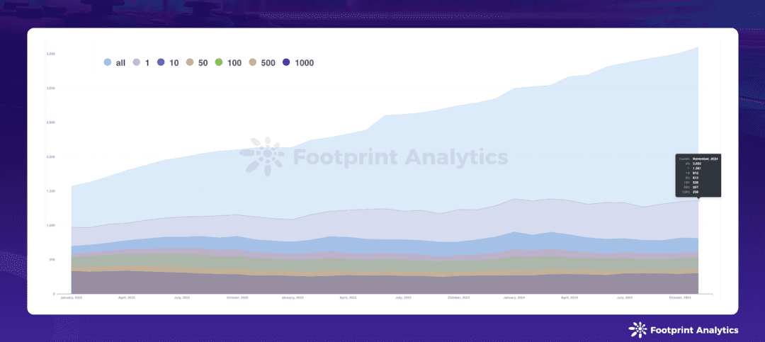 截至 11 月底,行业共有 3,602 款区块链游戏,其中 1,361 款保持活跃参与。这些游戏中有 298 款吸引了超过 1,000 名月活跃用户(MAU),占活跃游戏的 21.9%。